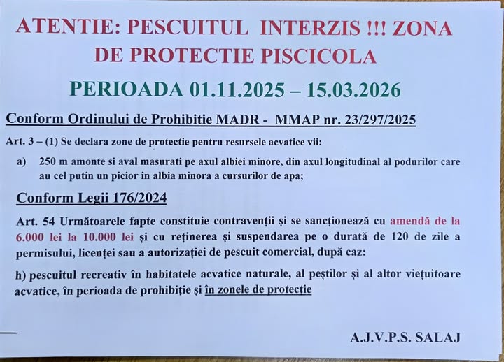 Asociația Județeană a Vânătorilor și Pescarilor Sportivi (AJVPS) Făgăraș reamintește tuturor pescarilor că, începând cu 1 noiembrie până la 15 martie, intră în vigoare reglementările pentru protecția peștilor în perioada de iernat. Potrivit Ordinului nr. 23/297/2025, au fost stabilite perioade și zone de prohibiție a pescuitului, precum și zone de protecție și refacere biologică a resurselor acvatice vii.