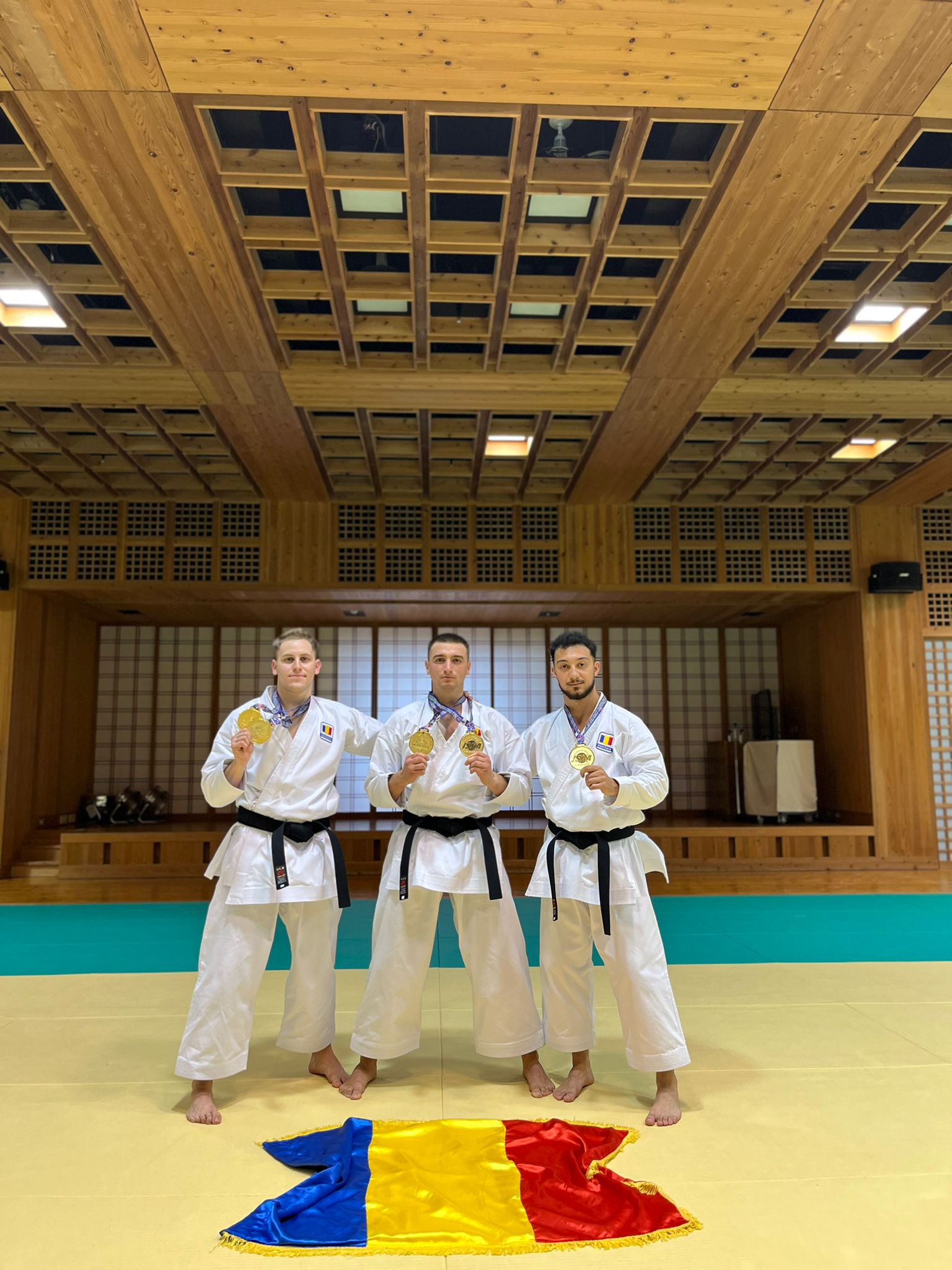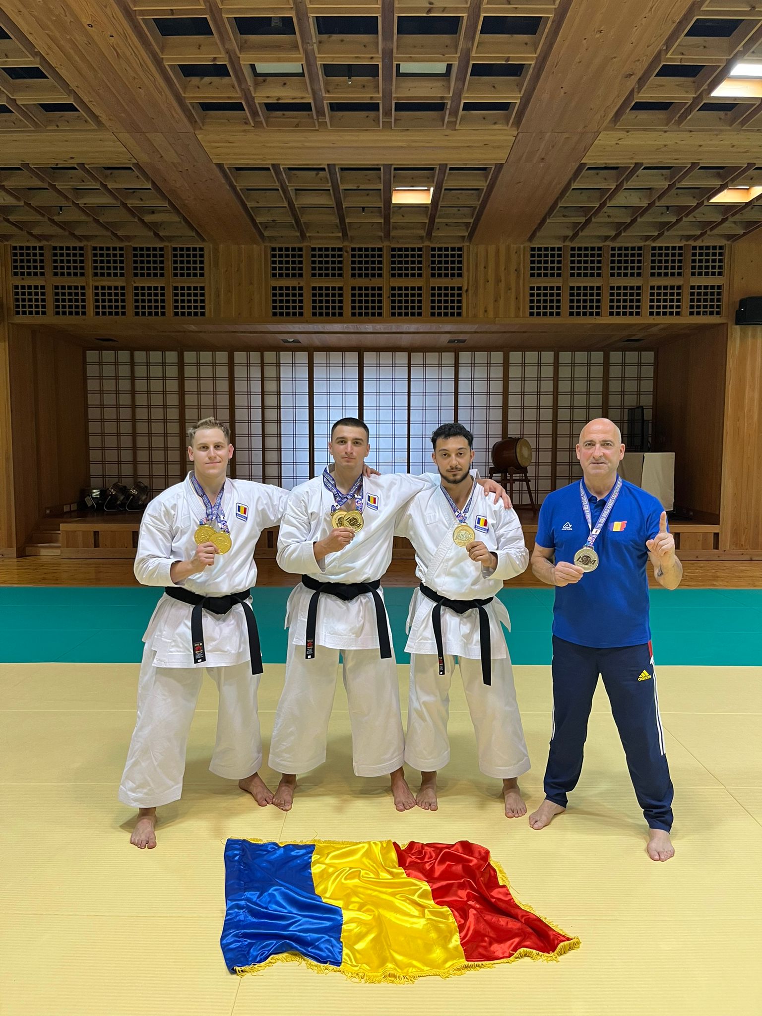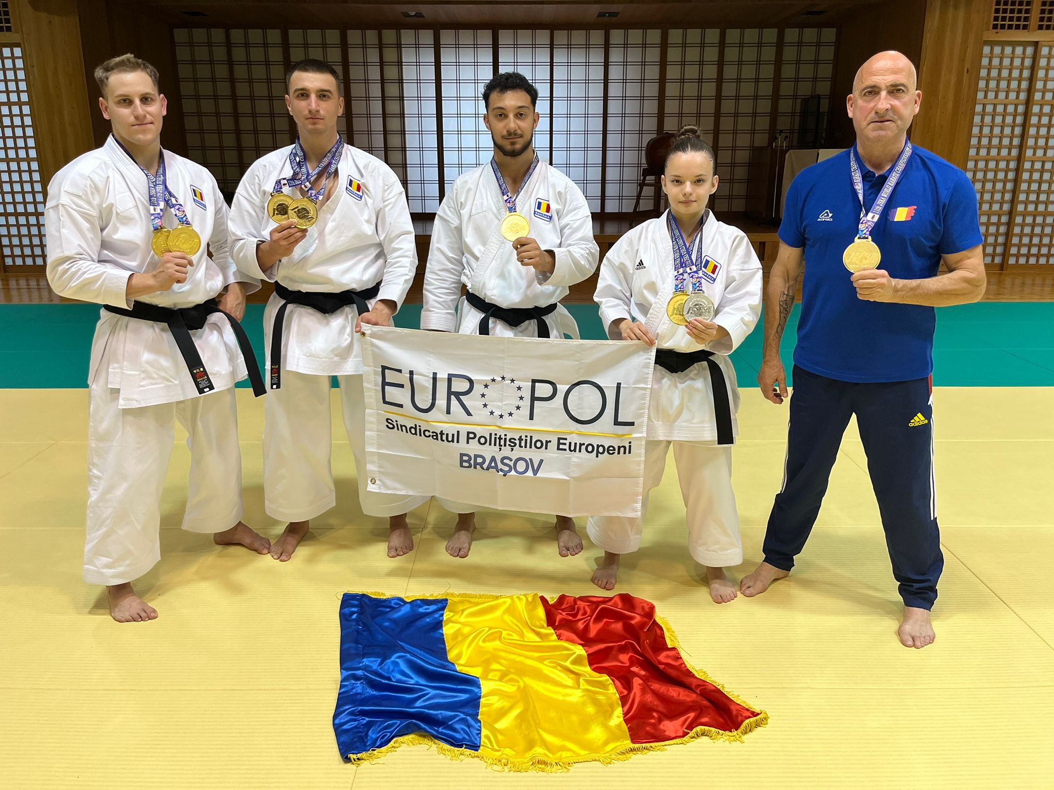 • „,, The senior team consisting of Ciprian Olaru, Alessio Toderel and Dănuț Mîndrean won the gold medal in team kata. We also have a gold medal for the mixed team consisting of Alexia Tănăsescu, Ciprian Olaru and Alessio Toderel. Yesterday, as you know, Alexia Tănăsescu won the silver in the individual kata event. We also have a silver medal obtained by me – Ioan Rîmbeț (athlete-coach) in the kata event for Veterans 2. Our athletes became double world team champions with an outstanding performance, without mistakes. Their work, discipline, will and sacrifice were rewarded accordingly. The athletes who competed in the team events were included in the 18-29 age group,” said Ioan Rîmbeț, the coach of the Karate section of CSM Făgăraș.