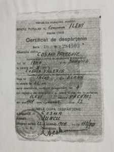 Căsătoria dintre Cosma Partenie (tata Ioan, mama Domnica) 41 ani şi Cosma Valeria (tata Iacob şi mama  Elena) 32 ani este desfăcută, conform  înregistrării din registrul de despărţanii al Sării Civile din localitatea Ileni, raionl Făgăraş din anul 1958, iunie 22. Numele după despărţenie: bărbatul Cosma, femeia Juncu. (Lucia BAKI)
