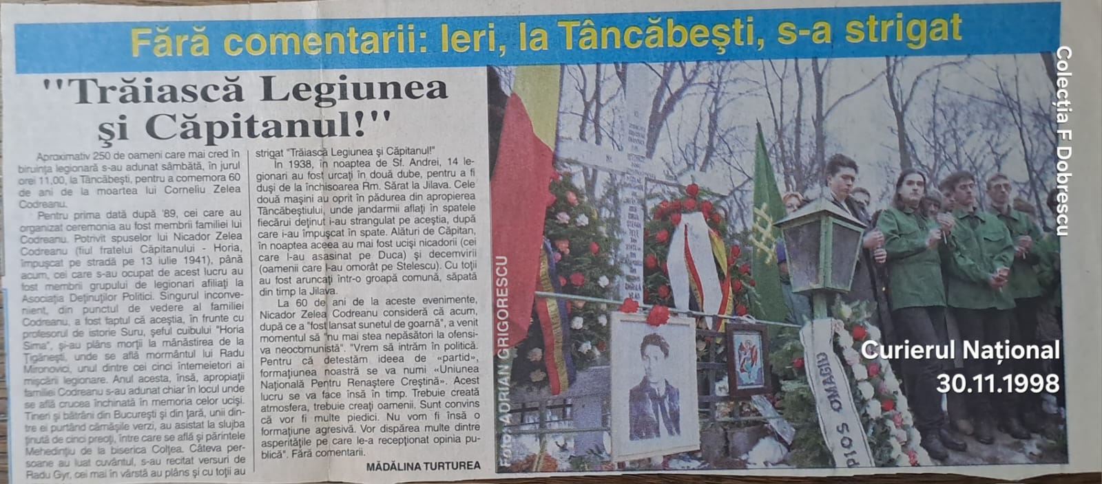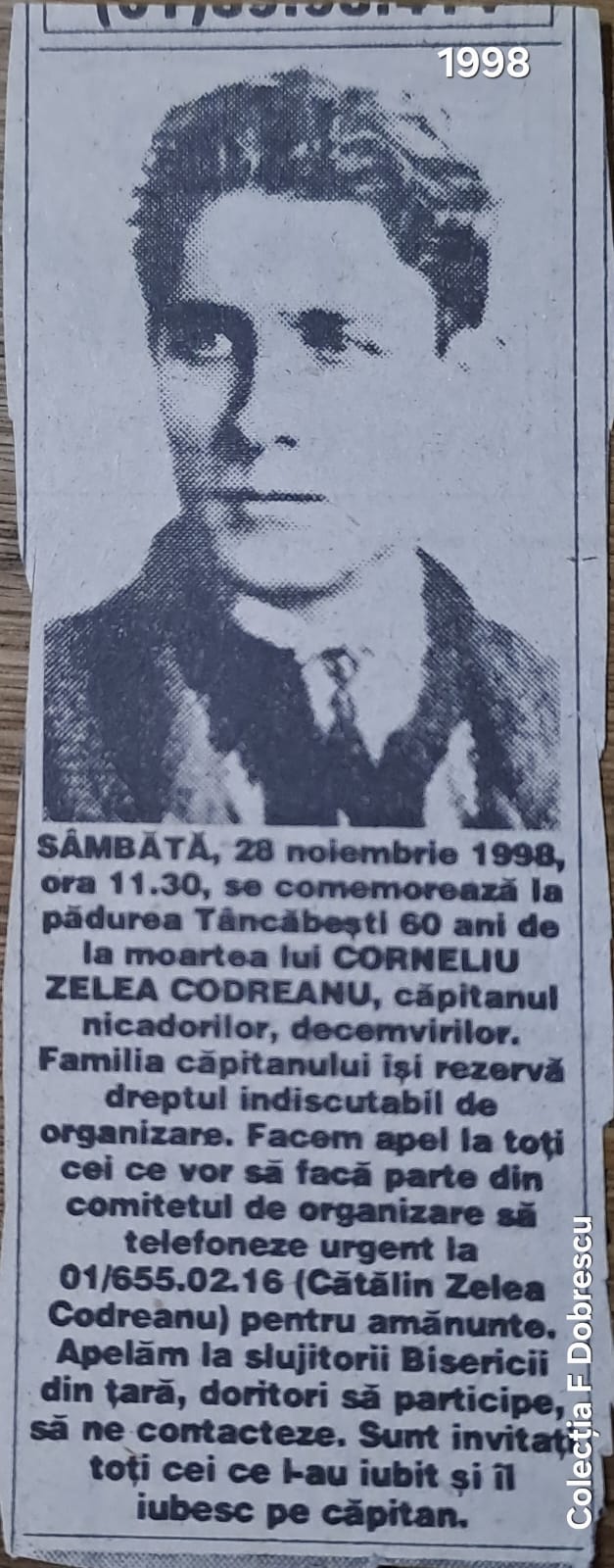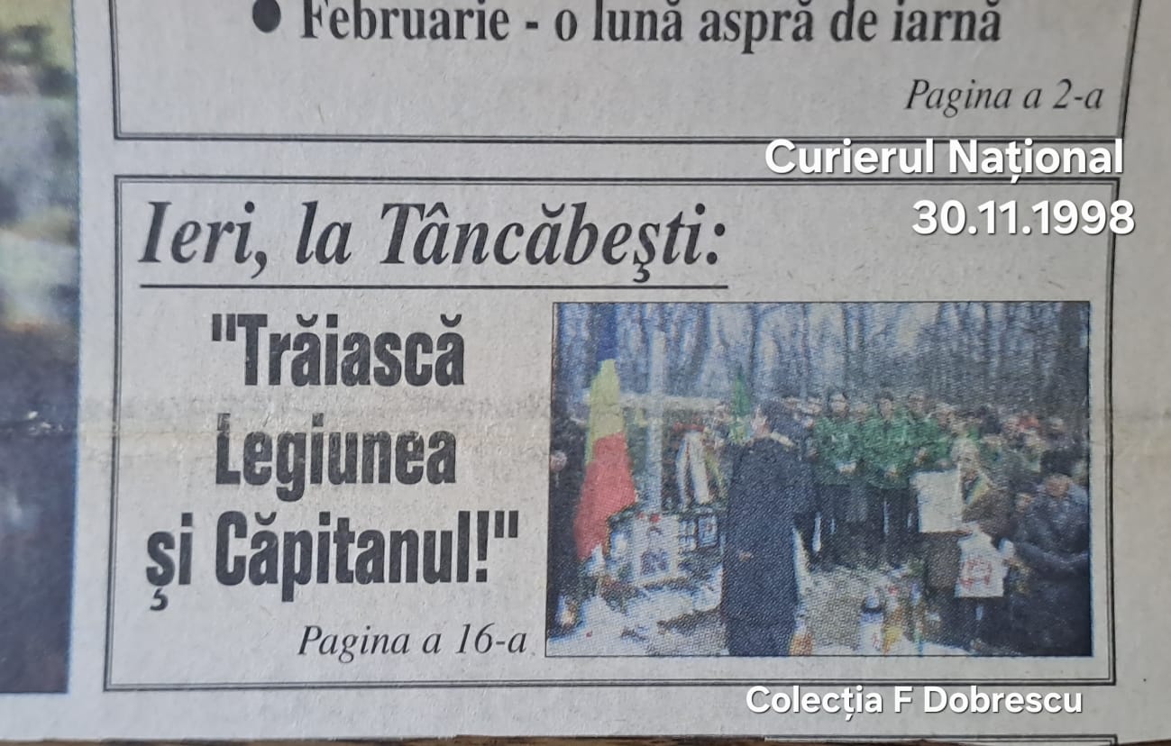 Redăm apoi ferpare din rubrica „Decese și comemorări” a ziarului România Liberă din noiembrie 1998, din septembrie și respectiv noiembrie 1999, anunțuri legate de comemorările organizate la Tâncăbești, lângă care apărea de fiecare și fotografia liderului legionar.