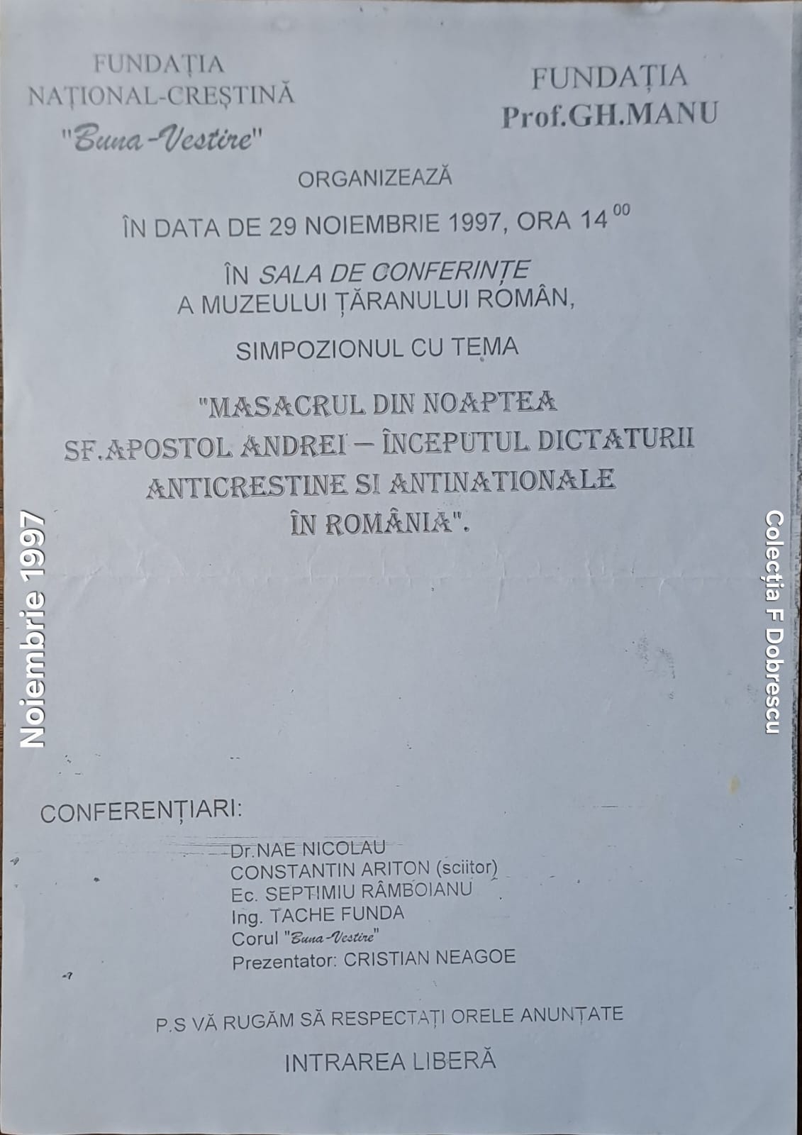 Un alt afiș, din 1997, realizat de Fundația Buna Vestire și Fundația George Manu, anunță organizarea pe 20 noiembrie 1997, în sala de conferințe a Muzeului Țăranului Român, a simpozionului cu tema „Masacrul din Noaptea Sfântului Apostol Andrei. Începutul dictaturii anticreștine și antinaționale în România”.