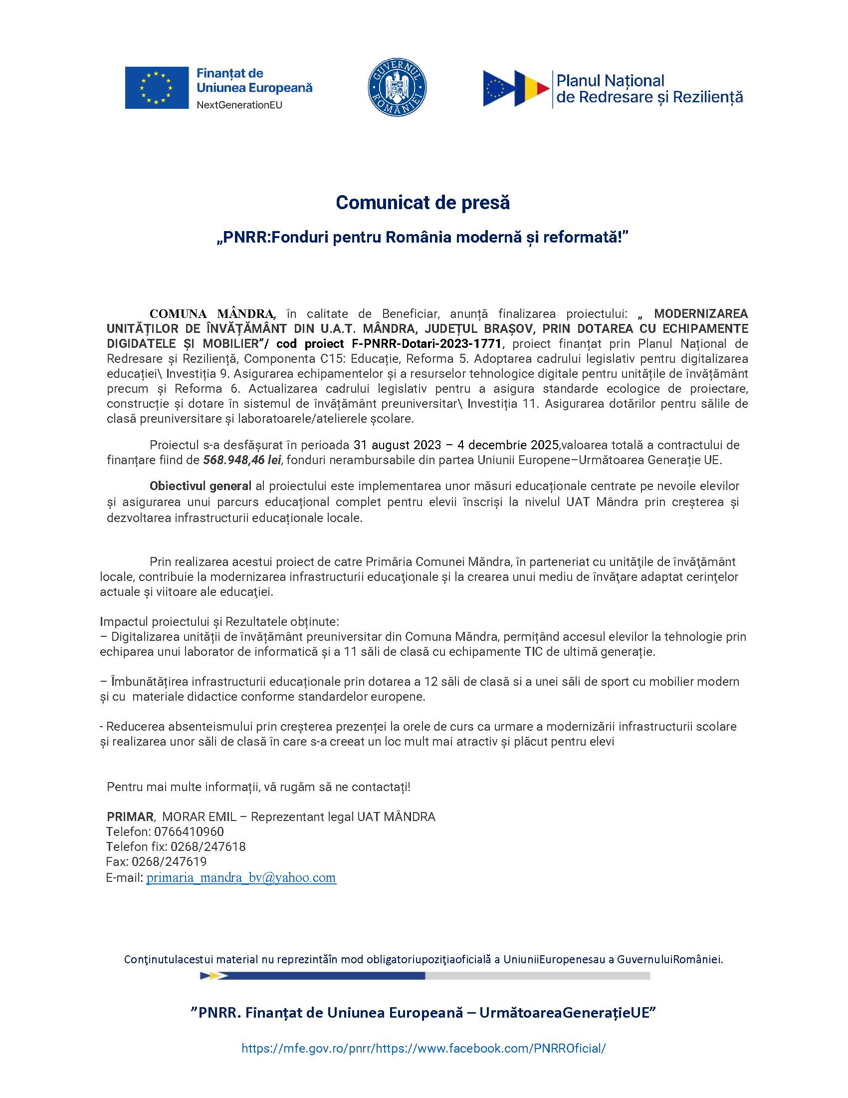 Mică publicitate Comunica de presa finalizare proiect UAT Mândra De către monitorfg.ro - decembrie 8, 2025 0 165 Facebook Twitter Pinterest WhatsApp