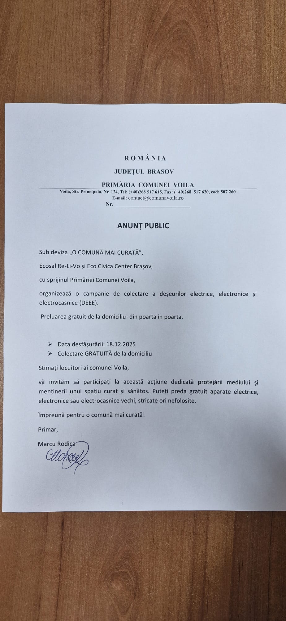 O campanie de colectare a deșeurilor electrice, electronice și electrocasnice (DEE) este organizată de Primăria Voila în data de 18 decembrie 2025. Acțiunea se va desfășura sub deviza ,,O comună mai curată“ de către societatea de salubritate RELIVO și EcoCivica Center Brașov. Colectarea deșeurilor este gratuită.