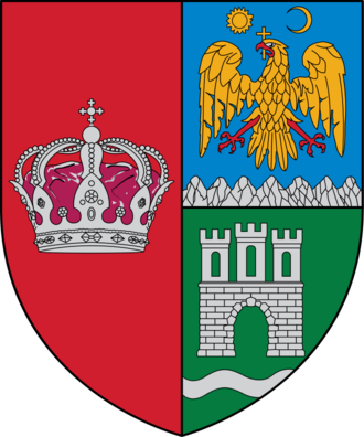 Partea din stânga este tăiată, având în partea de sus pe albastru acvila cruciată de aur cu ghearele şi ciocul roşii, privind spre dreapta, cu zborul luat. Este flancată de soare dreapta, semilună în ultimul pătrar stânga, de aur. Acvila surmontează şapte coline de argint. În partea de jos, în câmp verde, o poartă zidită de cetate, terminată cu trei turnuri, cu ferestre şi cu câte trei metereze. Turnul din mijloc este uşor supraînălţat. Totul este de argint. În vârful partiţiei un brâu undat de argint.