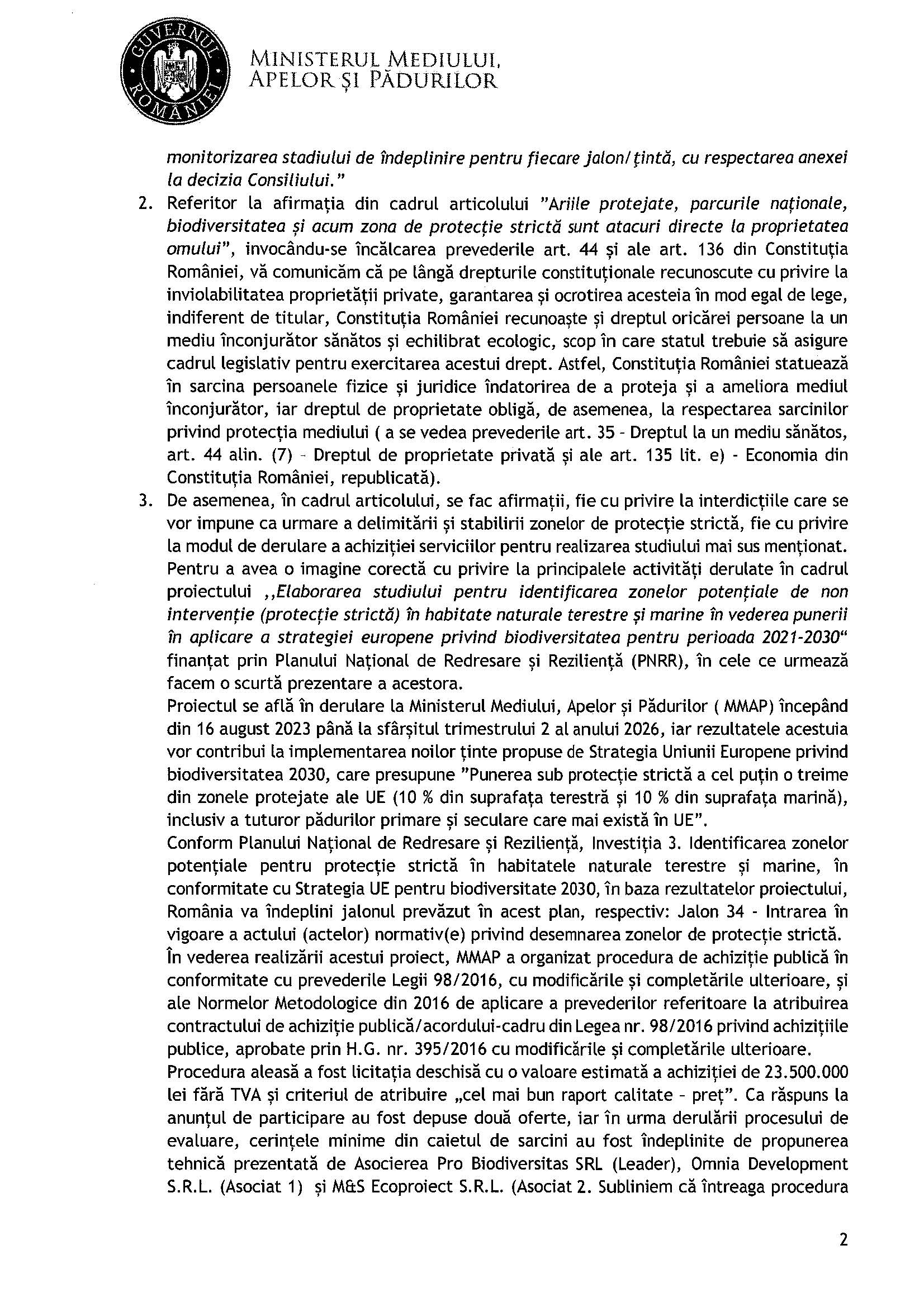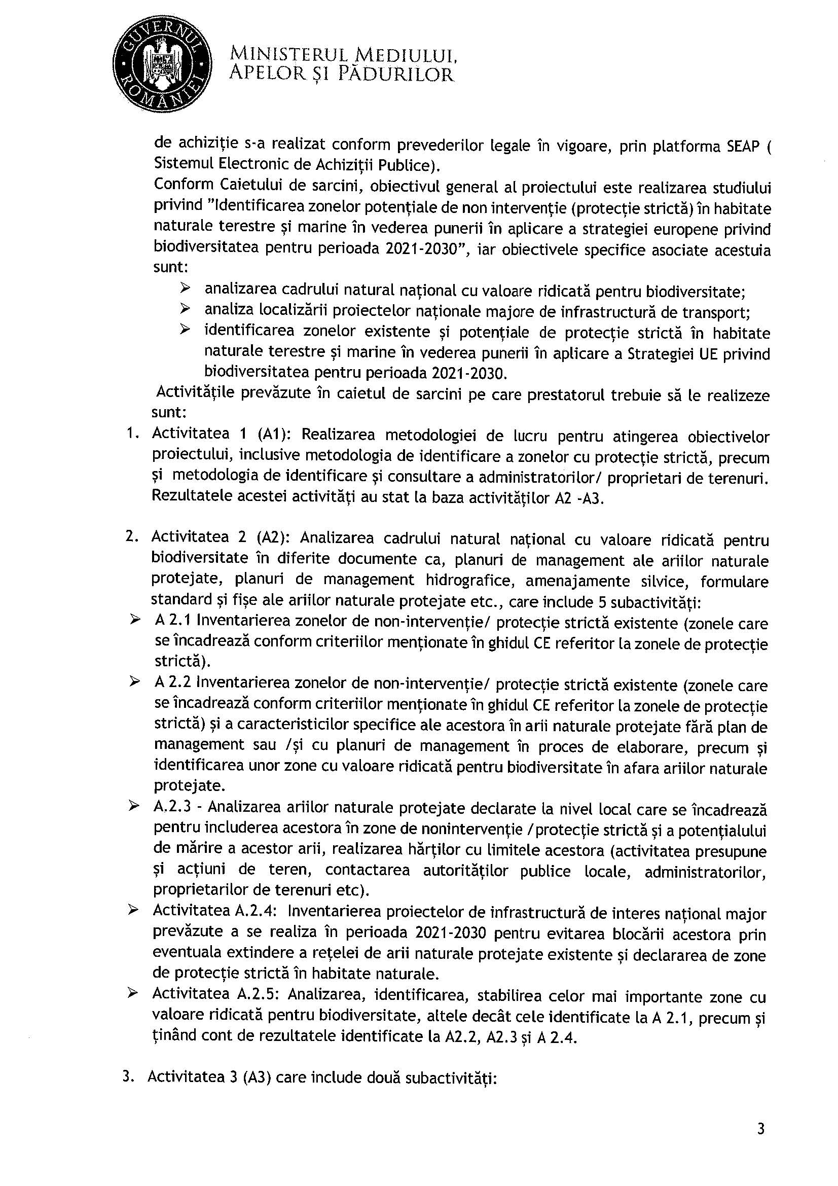Conform caietului de sarcini, confirmat și în Răspunsul Ministerului,  ,,analizarea ariilor naturale protejate declarate la nivel local care se încadrează pentru includerea în zone de protecție strictă și potențialului de mărire a acestor arii, realizarea hărților cu limitele acestora ( activitatea presupune și acțiuni în teren, contactarea autorităților locale, administratorilor, proprietarilor de terenuri, etc)“. Este specificată, în acest sens, o perioadă pentru consultarea celor interesați locali din zonele de protecție propuse, respectiv  1 ianuarie 2024-1 iulie 2025. Până la data limită nu a fost nicio consultare a ,,celor interesați“ din zonele de protecție strictă. Numai că în Răspuns  se specifică faptul că ,,au fost realizate consultări în această perioadă în cele 41 de județe unde au fost invitate ,,instituțiile relevante“ care pot sprijini proiectul.