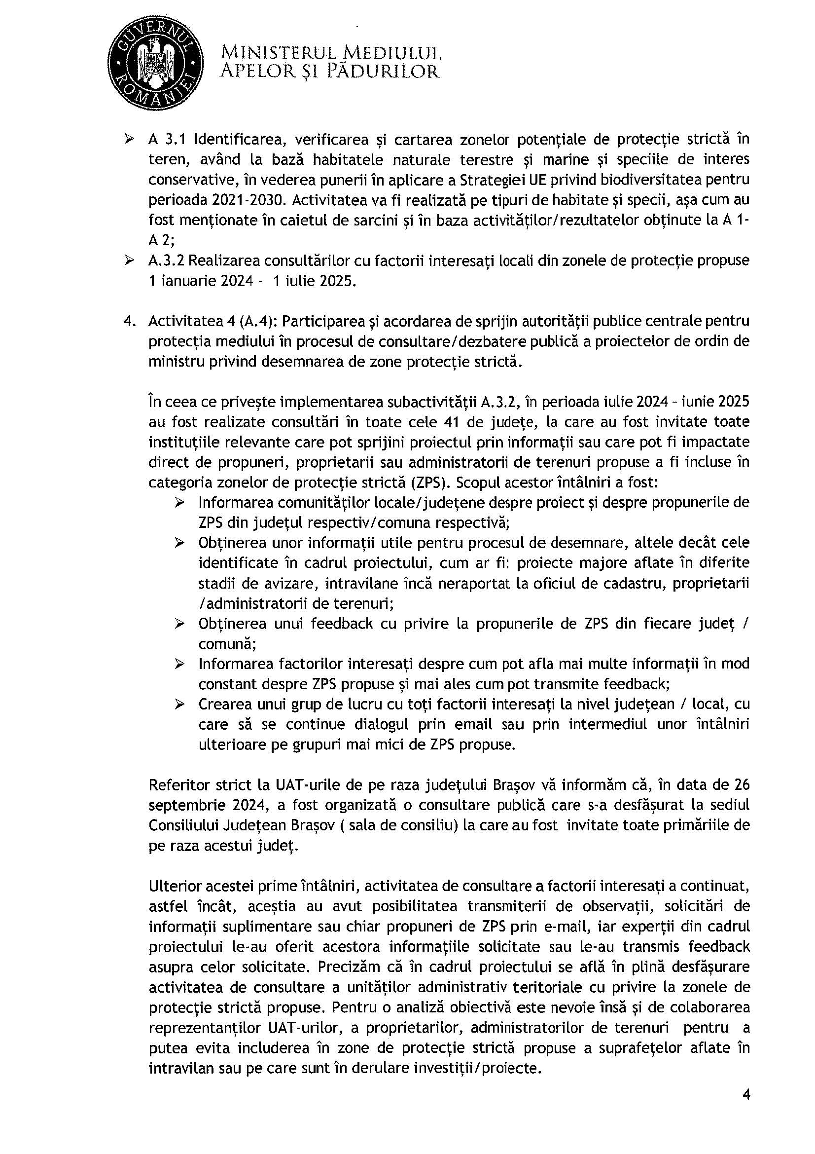 Conform caietului de sarcini, confirmat și în Răspunsul Ministerului, ,,analizarea ariilor naturale protejate declarate la nivel local care se încadrează pentru includerea în zone de protecție strictă și potențialului de mărire a acestor arii, realizarea hărților cu limitele acestora ( activitatea presupune și acțiuni în teren, contactarea autorităților locale, administratorilor, proprietarilor de terenuri, etc)“. Este specificată, în acest sens, o perioadă pentru consultarea celor interesați locali din zonele de protecție propuse, respectiv 1 ianuarie 2024-1 iulie 2025. Până la data limită nu a fost nicio consultare a ,,celor interesați“ din zonele de protecție strictă. Numai că în Răspuns se specifică faptul că ,,au fost realizate consultări în această perioadă în cele 41 de județe unde au fost invitate ,,instituțiile relevante“ care pot sprijini proiectul.