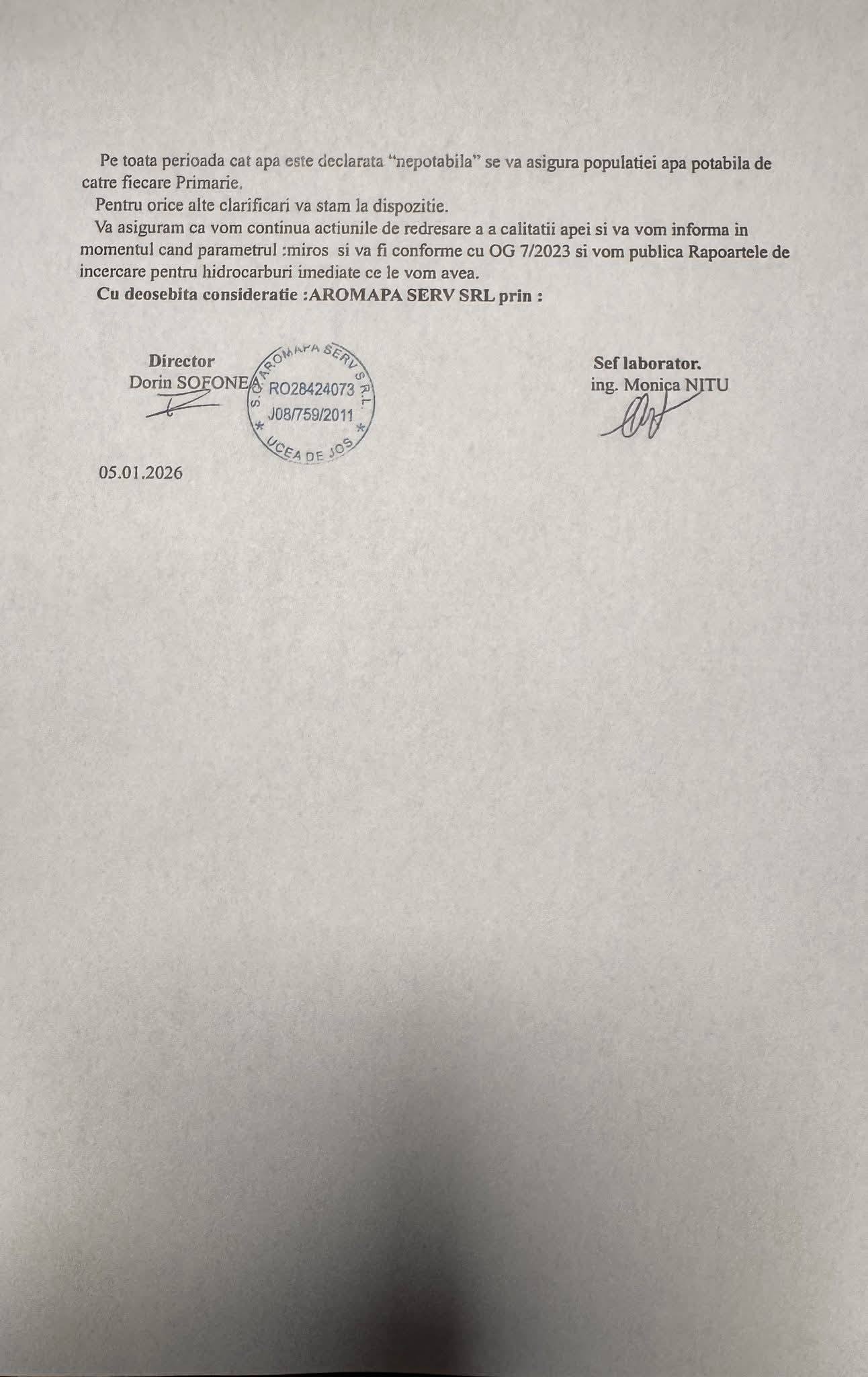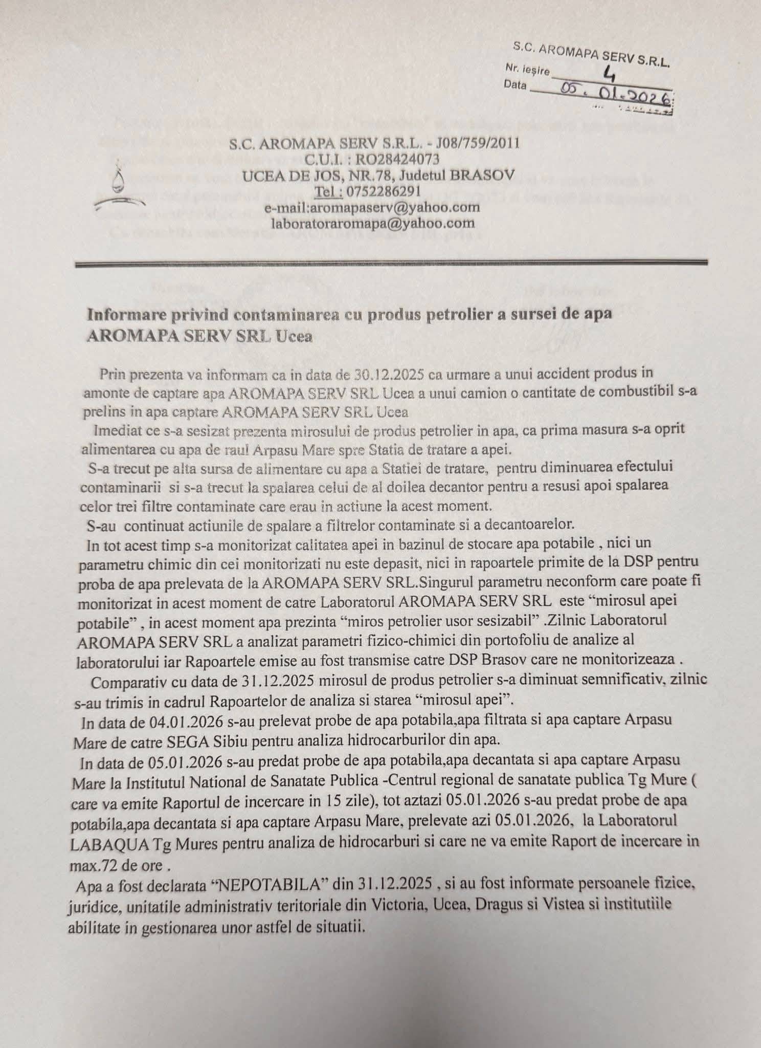 Alimentarea cu apă potabilă a satelor din comunele Ucea, Drăguș, Viștea (excepție Rucăr) și orașul Victoria este în continuare sistată. Astăzi, 5 ianuarie a.c., au fost trimise probe de apă la Laboratorul LABAQUA Tg. Mureș pentru efectuarea analizelor pentru hidrocarburi. Rezultatul acestor analize va fi primit în 72 de ore. Dacă apa analizată va fi în parametrii normali, apa furnizată de Aromapa Serv Ucea va putea fi consumată. În paralel, Aromapa Serv Ucea a prelevat probe de apă pe care le-a trimis la Centrul Regional de Sănătate Publică Tg. Mureș, care va emite un raport în 15 zile. Aromapa Serv Ucea a efectuat analize zilnic la laboratorul propriu.