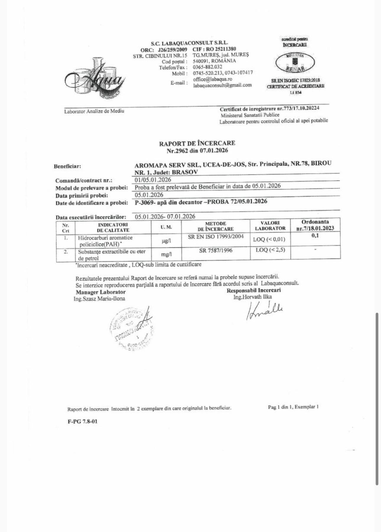 Pentru o bună informare, societatea prezintă Rapoartele de încercare la probele prelevate în data de 5 ianuarie 2026. Au fost determinate în laboratorul Labaqua Consult Tg. Mureș, acreditat, hidrocarburi aromatice policiclice și substanțe extractibile cu eter de petrol.