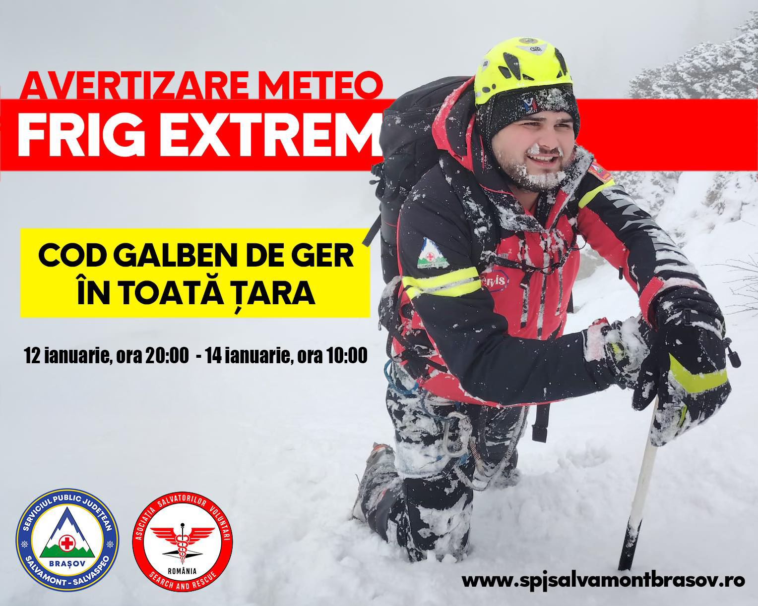 Salvatorii montani din cadrul Serviciul Județean Salvamont Brașov informează că zona montană și regiunile intracarpatice se vor confrunta, în continuare, cu episoade de ger accentuat, în contextul a două atenționări meteorologice succesive de tip Cod Galben, emise de ANM pentru intervale consecutive.