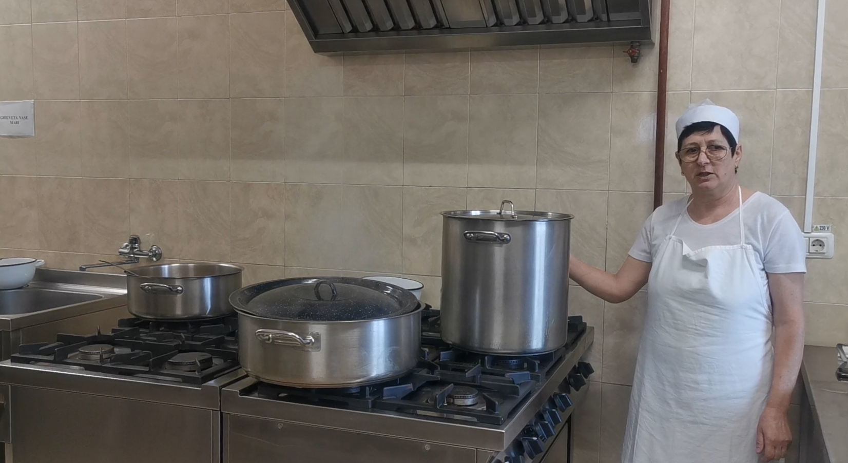 - ,,Zilnic pregătim mâncarea pentru cei 115 beneficiari, elevi și pensionari. Facem ciorbe de tot felul, felul II și desert, toate în funcție de indicațiile dieteticianului. La fiecare masă avem carne în meniu. La desert facem plăcintă cu mere, cornuri cu rahat, rulouri, dar trebuie să le oferim și fructe sau iaurt. În vacanțele copiilor avem mai puțini beneficiari“ a spus Mihaela Suciu, bucătăreasa cantinei cu 15 ani vechime în bucătărie.