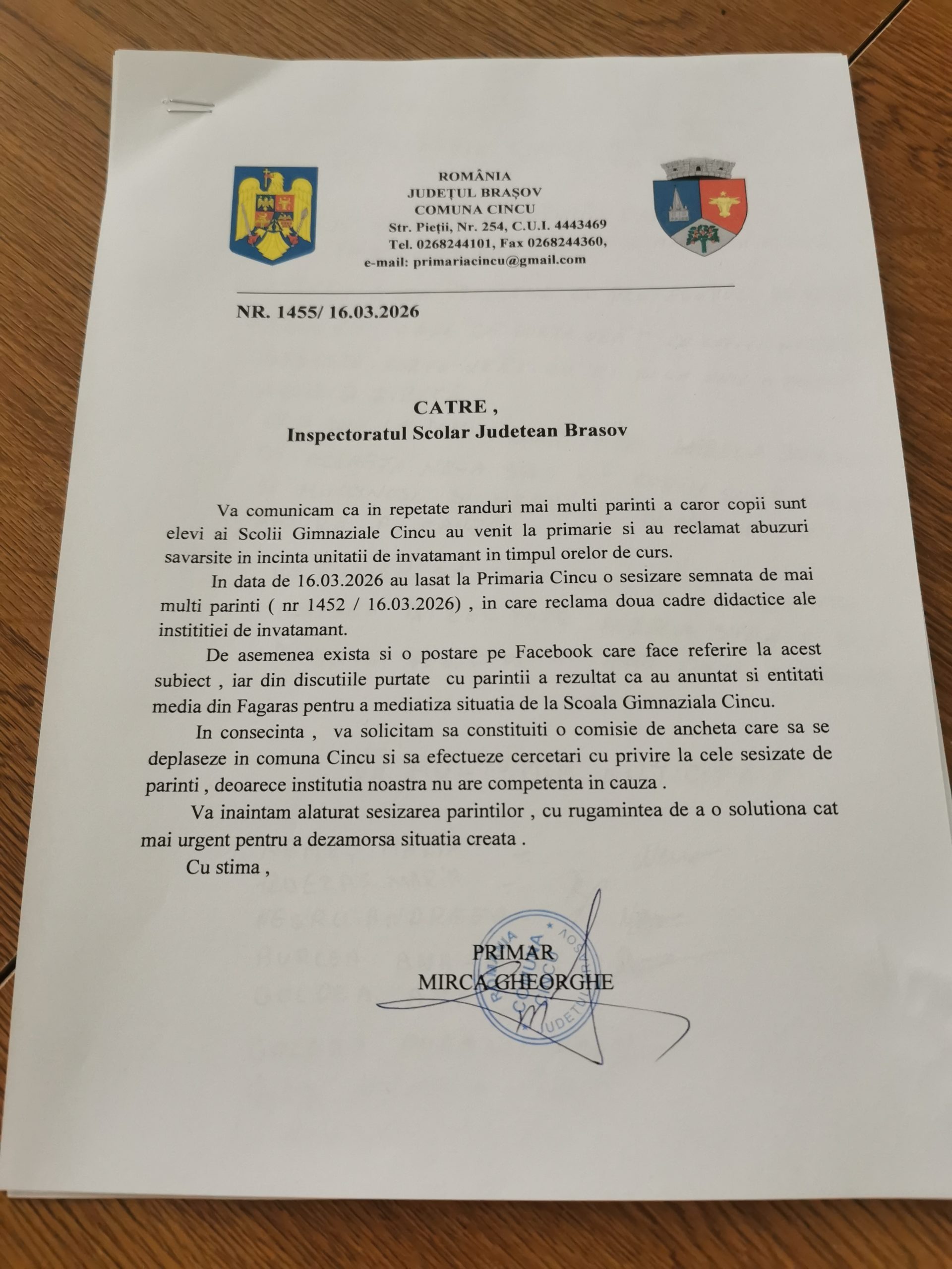 O sesizare a ajuns și la Primăria Cincu, dar primarul a remis petiția Inspectoratului Școlar Județean.