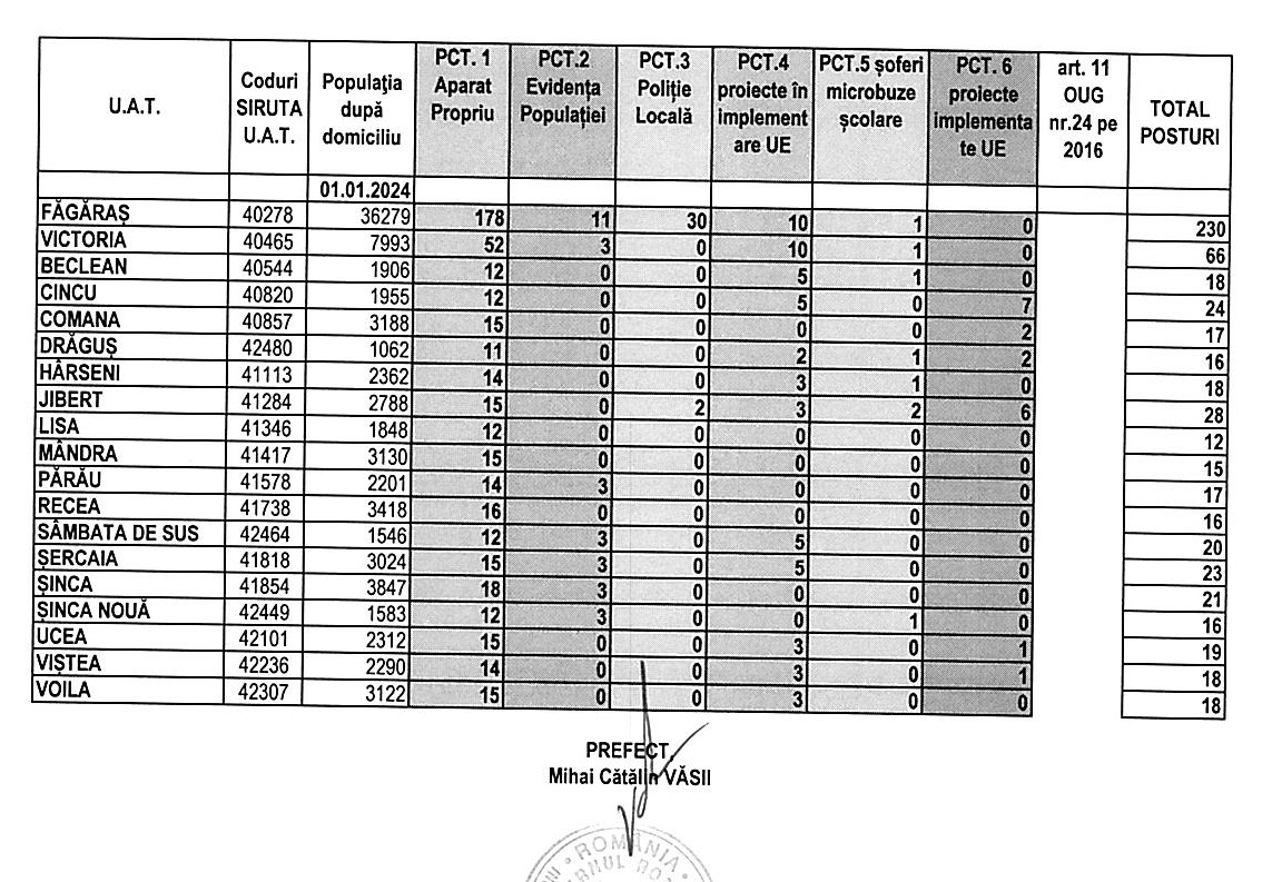 Făgărașul a declarat o populație de 36.279 persoane, este un număr teoretic întrucât practic populția nu atinge nici jumătate. La această populație, Prefectul a stabilit un număr total de posturi de 230 din care în aparatul propriu al primarului 178, la evidența populației 11posturi, la poliție locală 30 de posturi, un post de șofer pentru microbuz și 10 posturi la proiecte europene în implementare.  Reamintim că în 2023, luna aprilie, UAT Făgăraș avea aprobate 254 posturi, iar prin HCL nr. 302/2023 au fost aprobate 185 posturi. În urmă cu alți 2 ani, în 2021, UAT Făgăraș avea aprobate 133 posturi prin HCL nr. 278/19.11.2021. Cu alte cuvinte în doi ani, primarul PSD a mai angajat în Primăria Făgăraș încă 52 de persoane. Așa cum arată datele, în 2026 față de anii trecuți, primarul are mână liberă la angajări, posturile aprobate fiind în număr de 230.