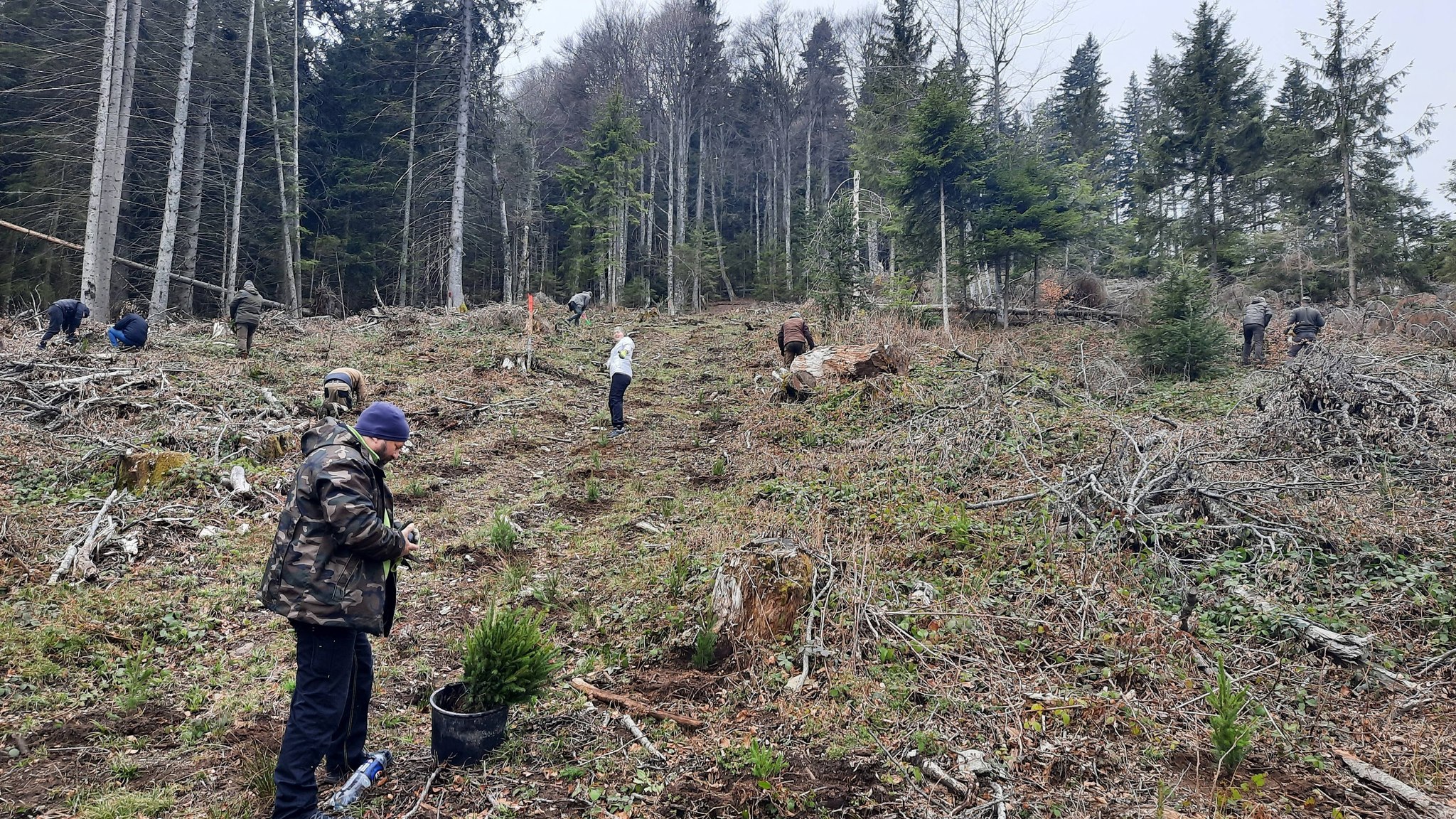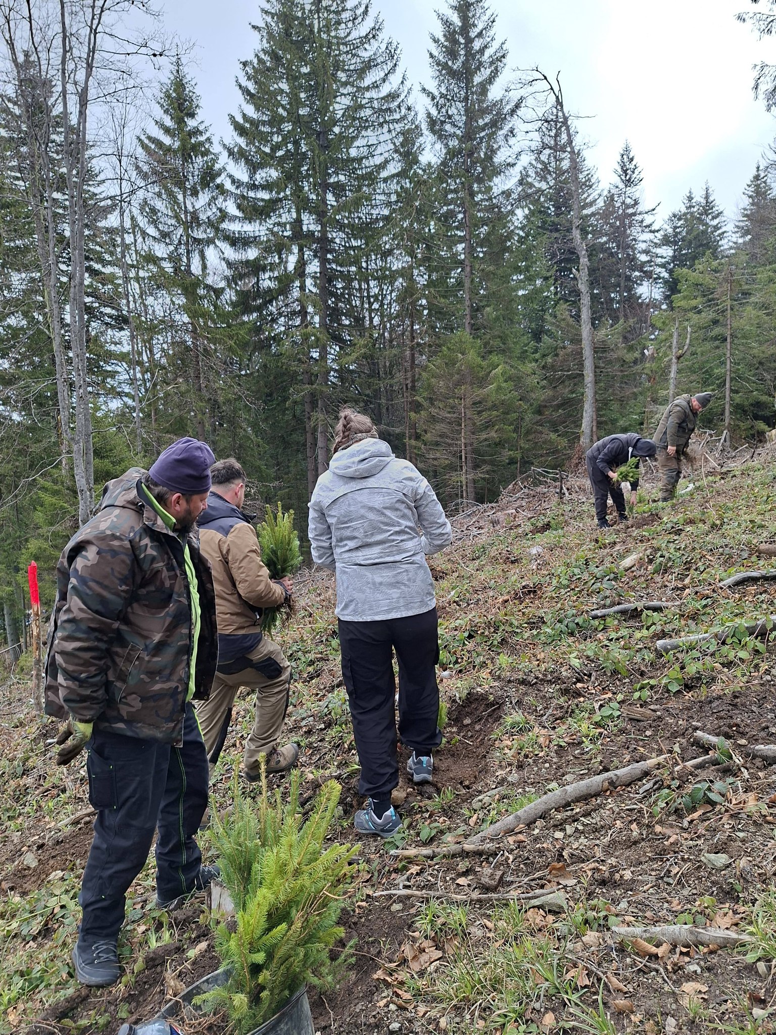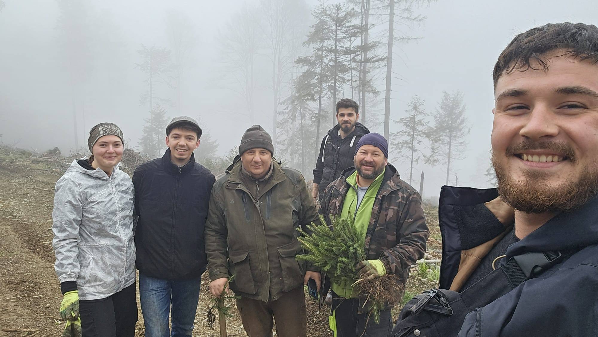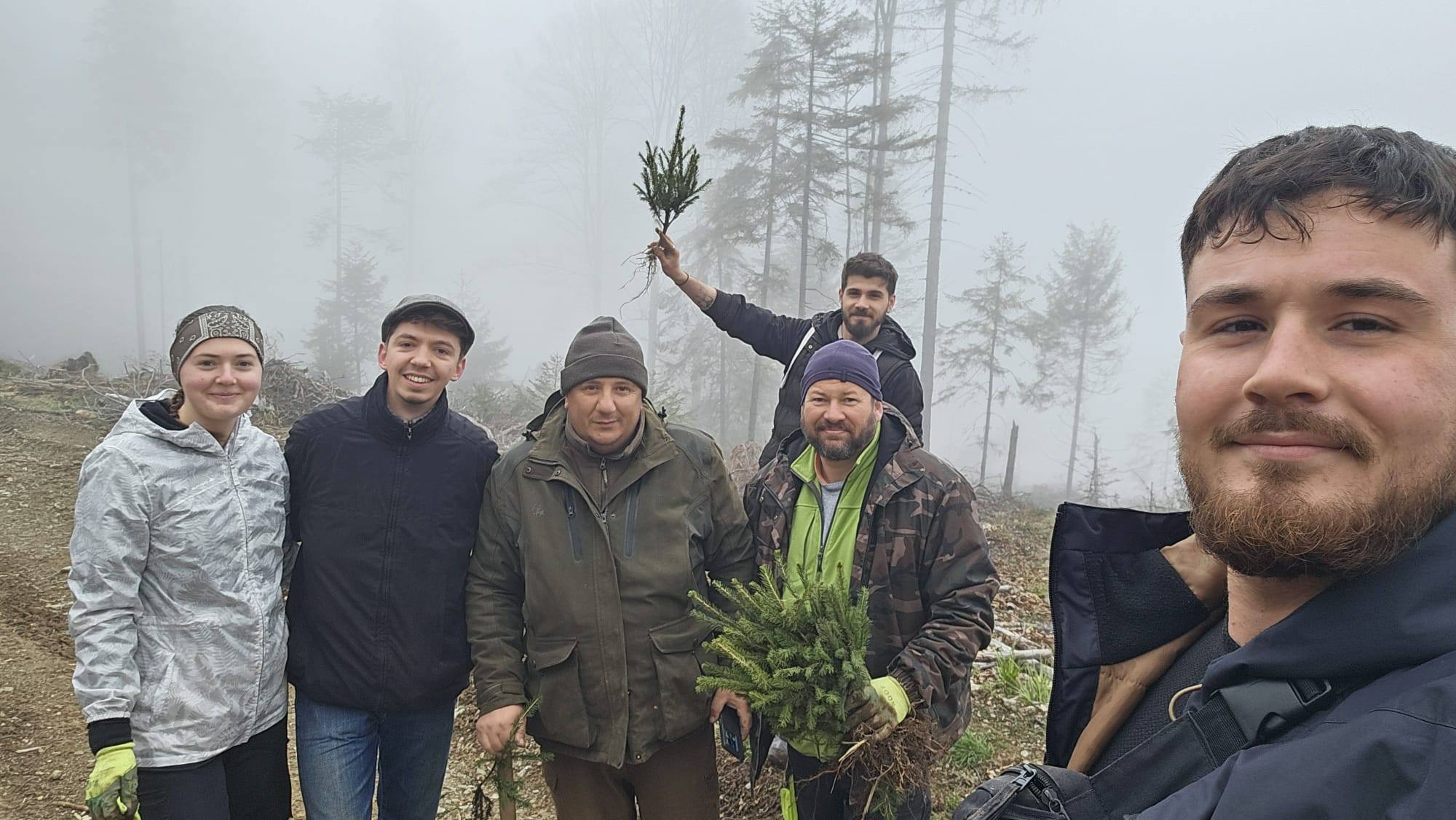 Foto. Ocolul Silvic ,,Pădurile Făgărașului“, o nouă acțiune de plantare puieți de molid în zona Lisa-Breaza. Personalul ocolului, ajutat de studenții de la Facultatea de Inginerie a Lemnului Brașov
