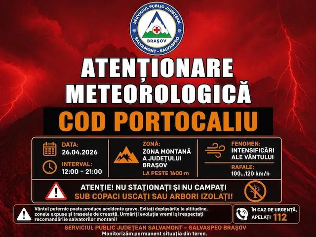 Administrația Națională de Meteorologie (ANM) a emis o serie de avertizări de ultimă oră pentru județul Brașov, valabile pe parcursul zilei de duminică, 26 aprilie. Meteorologii avertizează că județul se va confrunta cu fenomene extreme, viteza vântului urmând să atingă pragul unui uragan în zonele de creastă. Cea mai periculoasă situație este prognozată pentru zona montană înaltă a județului (Carpații Meridionali și de Curbură). Programul avertizărilor este următorul: